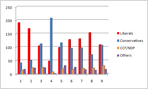 | Election | Liberals | Conservatives | CCF/NDP | Others |